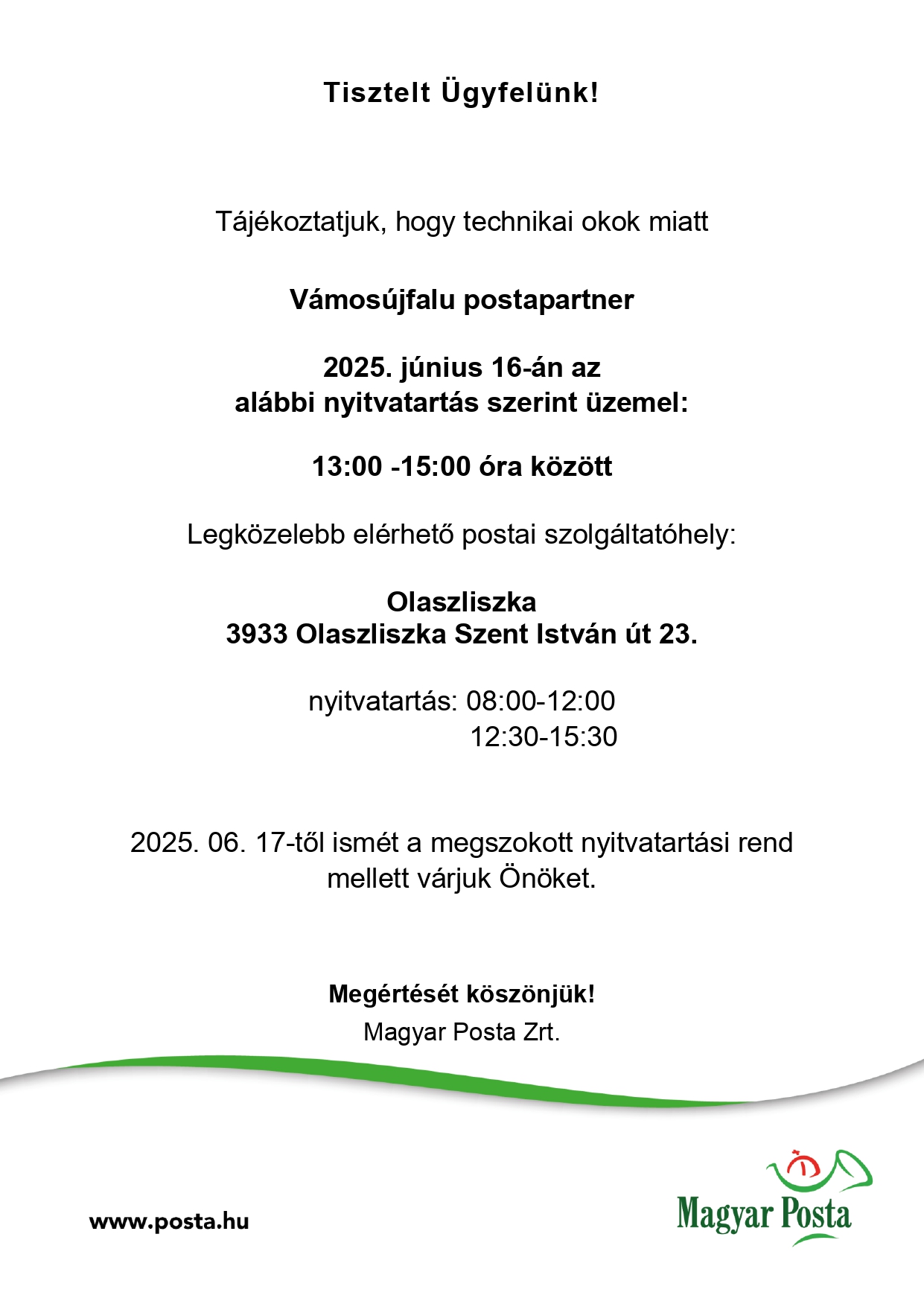 Vámosújfalu postapartner 2025. június 16-án az alábbi nyitvatartás szerint üzemel